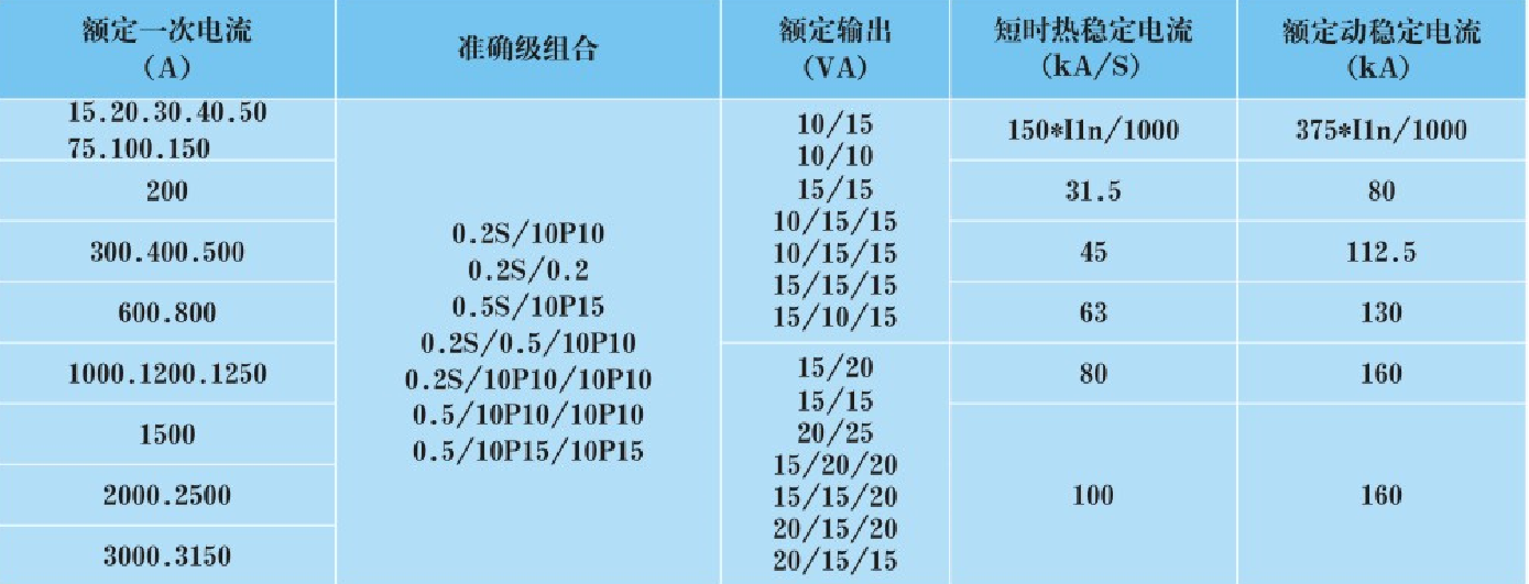 額定次電流,準(zhǔn)確級組合及相應(yīng)額定輸出和動、熱穩(wěn)定電流見下表: